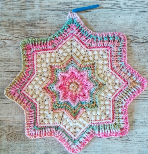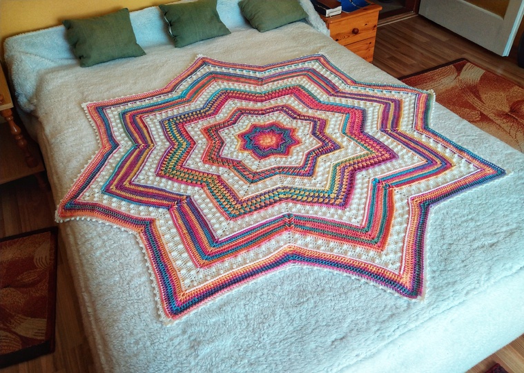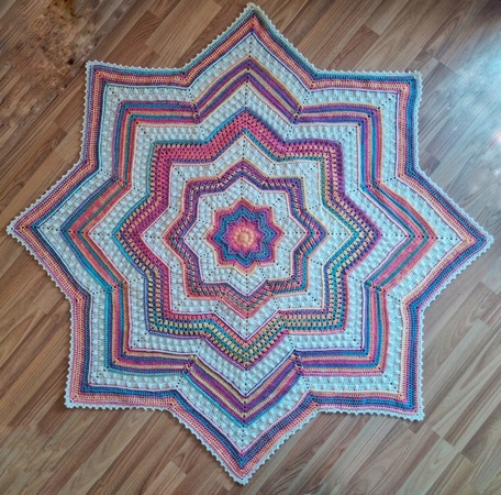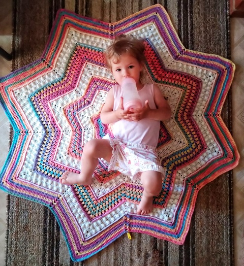 It is a gorgeously textured, eight-point star blanket which can be made as a baby/toddler blanket or a nice and snuggly lap blanket.
