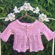 This pretty babies cardigan is crocheted in Dk Cotton. It is crocheted from the top down, using tr(dc) to armhole and then an lacy shell and V stitch pattern is worked for the lower part. The lacy pattern is then crocheted for the sleeve. A shell collar is then worked to complete the cardigan.