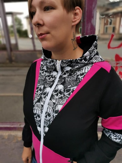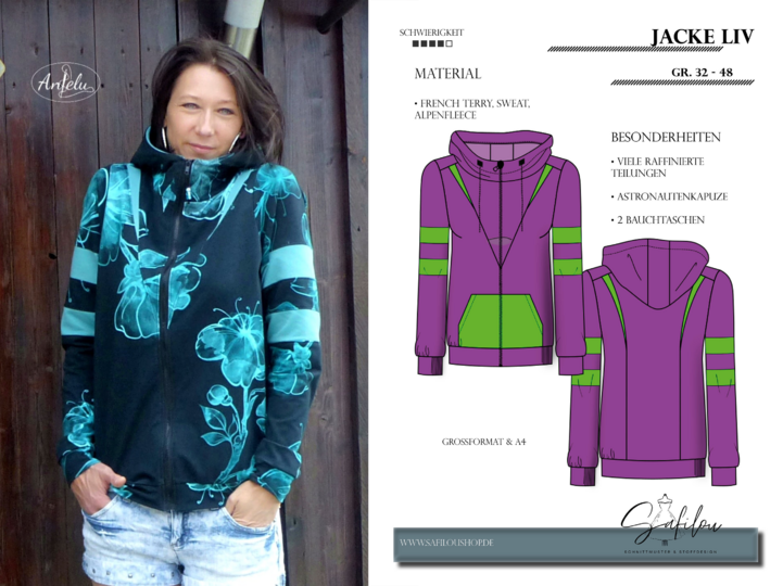 Tauche ein in die Welt der Sweatjacke Liv, die in den Größen 32 bis 48 erhältlich ist und durch ihre Vielseitigkeit und ihren einzigartigen Stil besticht. Dieses durchdachte Schnittmuster hebt sich durch seine kunstvollen Teilungen im Vorder- und Rückenteil hervor. Diese Detailarbeit sorgt nicht nur für einen beeindruckenden visuellen Effekt, sondern bietet auch die ideale Möglichkeit, Stoffreste oder spezielle Panels kreativ zu verarbeiten. Die Jacke Liv ist mit einer innovativen Astronautenkapuze ausgestattet, die ihr einen modernen, futuristischen Touch verleiht. Zwei großzügige Bauchtaschen bieten nicht nur Platz für deine alltäglichen Essentials, sondern fügen dem Design eine praktische Komponente hinzu, die den alltäglichen Tragekomfort erhöht. Für alle, die ihre Garderobe mit einem trendigen und individuell gestalteten Kleidungsstück bereichern möchten, ist die Sweatjacke Liv die perfekte Wahl. Sie vereint Stil und Funktionalität in einem einzigartigen Design, das sowohl für den Alltag als auch für besondere Anlässe geeignet ist. Ob du dich für einen lässigen Look entscheidest oder sie mit eleganteren Stücken kombinierst – die Sweatjacke Liv wird garantiert zu einem unverzichtbaren Highlight in deinem Kleiderschrank.