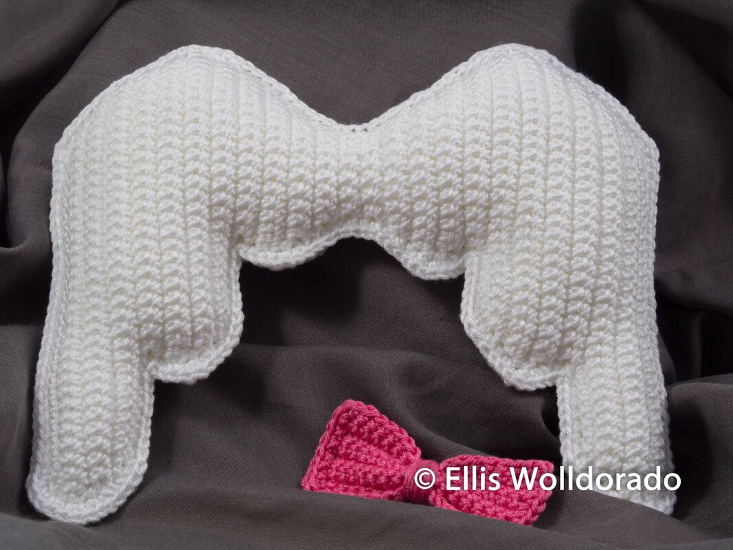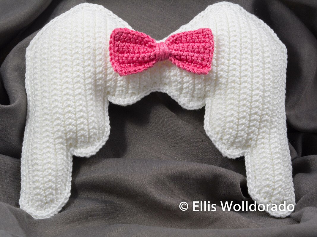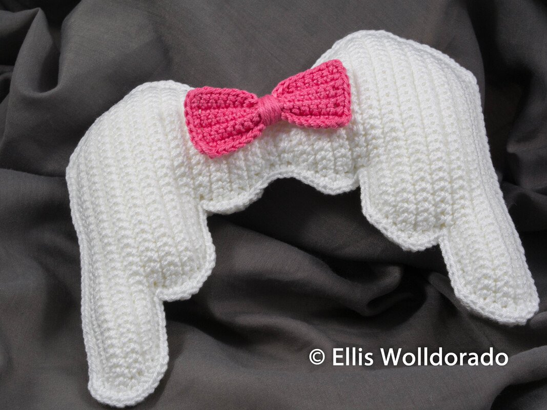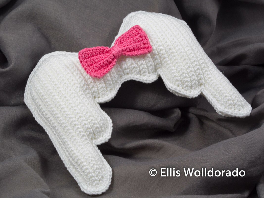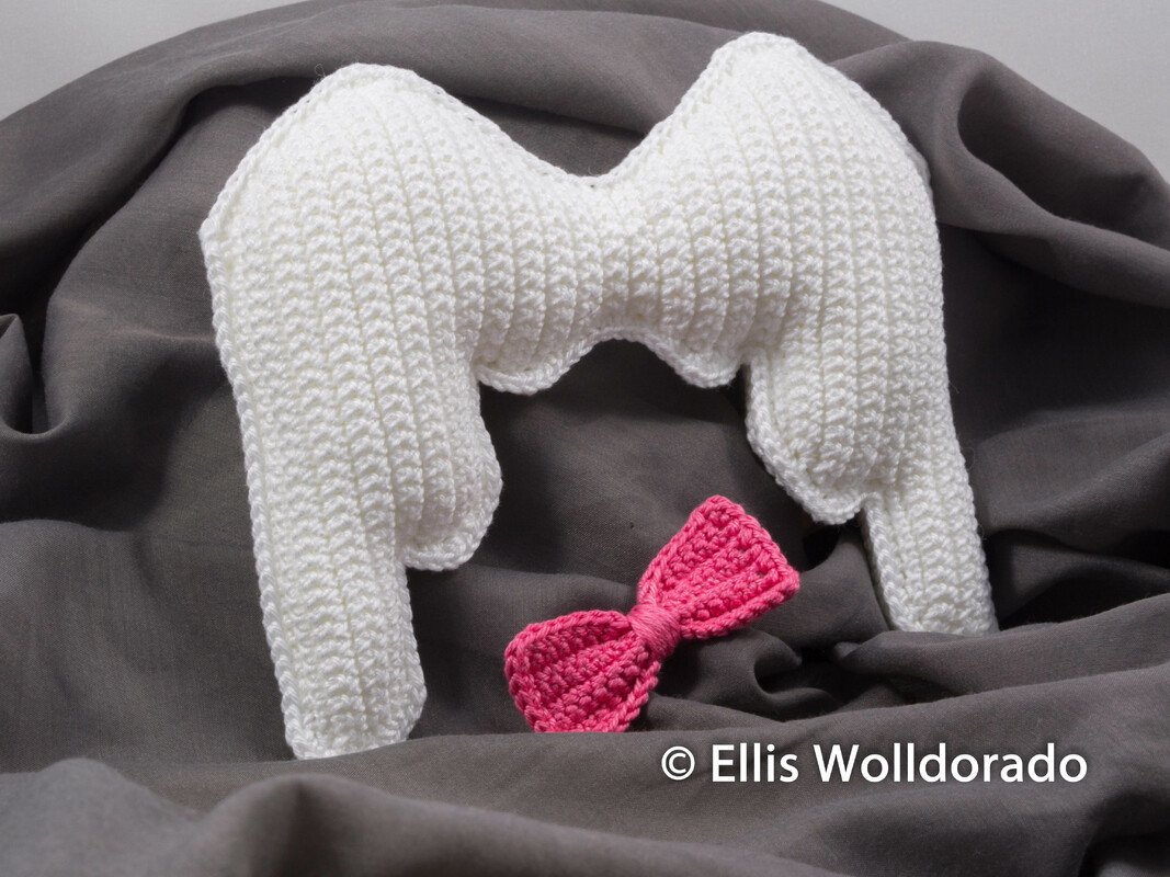 In der hier erhältlichen Anleitung (PDF-Datei) erfährst Du, wie ich die Engelsflügel und auch die Schleife gehäkelt habe. Bzgl. der Schleife musst Du Dich nur entscheiden, ob Du diese feste an die Flügel annähen möchtest oder ob Du lieber eine abnehmbare Schleife möchtest. Beide Varianten werden in der Häkelanleitung aufgegriffen. Natürlich kannst Du die Schleife auch komplett weglassen...