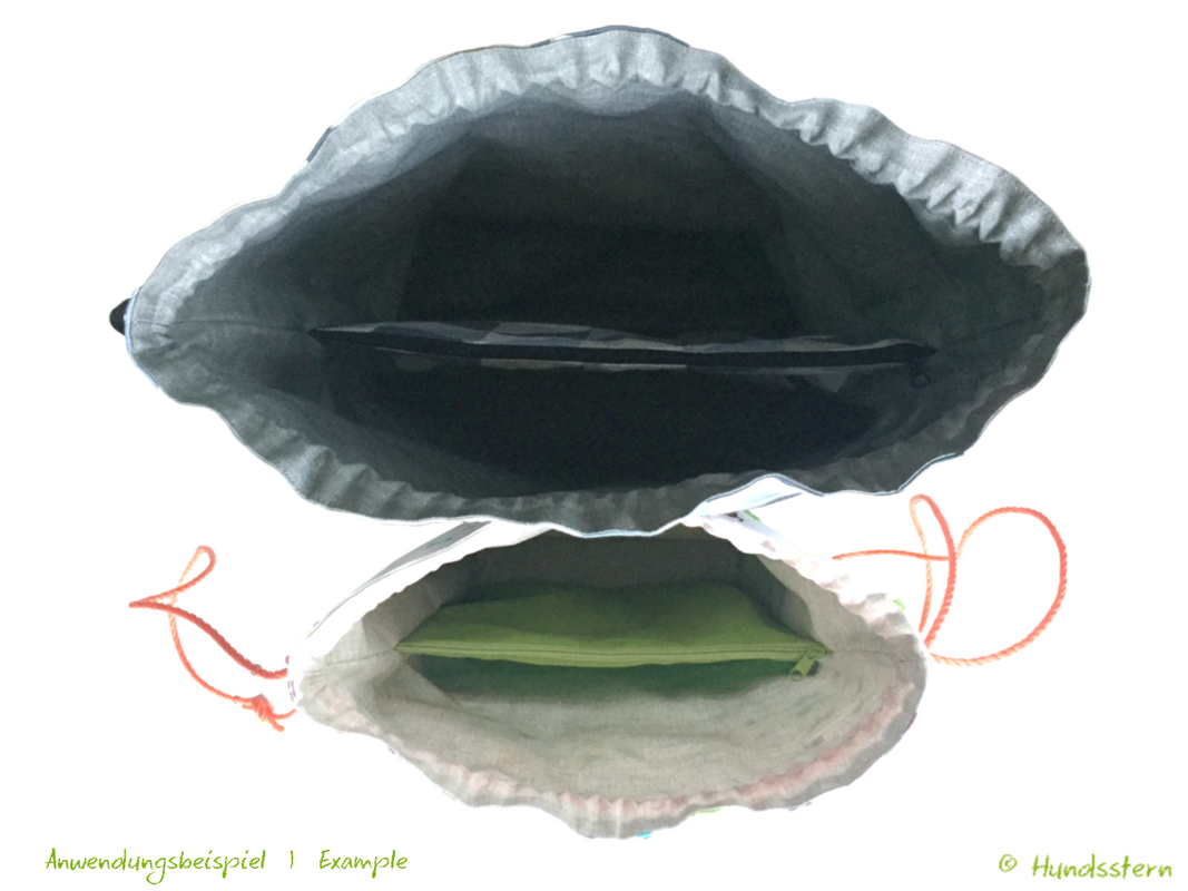 The spacious ALBY drawstring backpack can be sewn either simply with just one large compartment or with an additional zipped outer pocket and divided lining. This creates two compartments and another large zipped pocket e.g. for keys, wallet etc.
