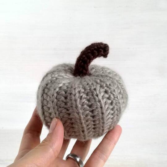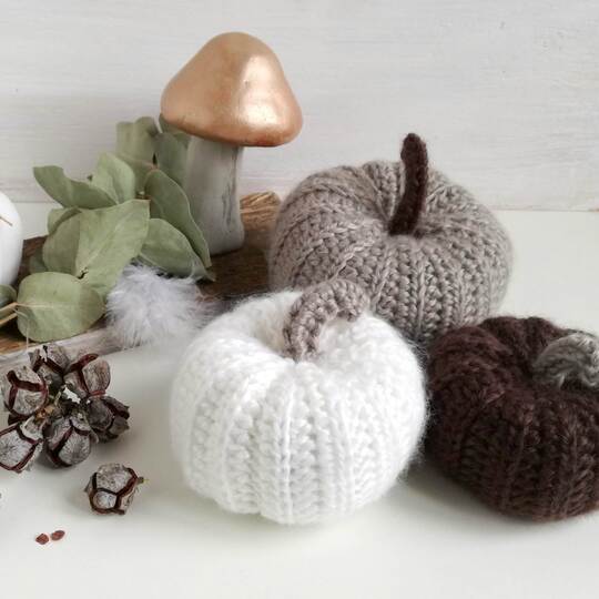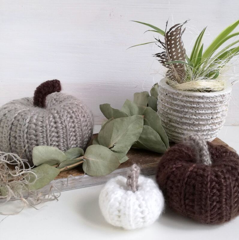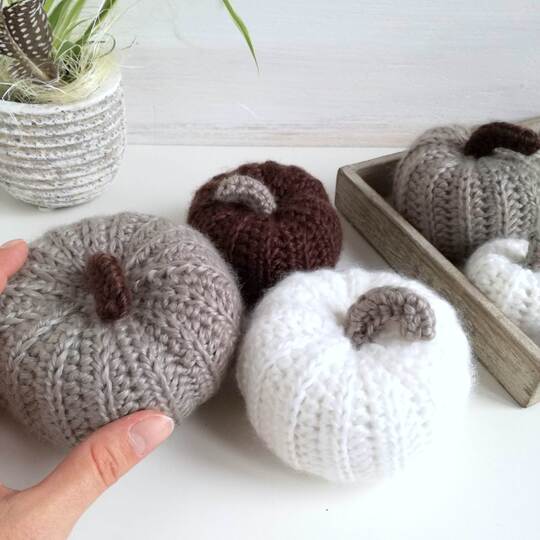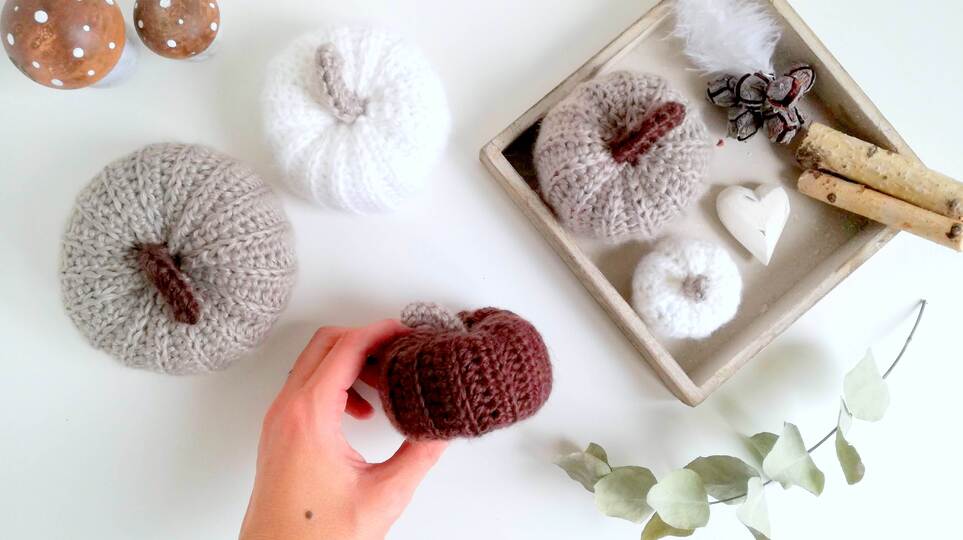 Measurements: small brown pumpkin: 3.5 in / 9 cm | medium white: 4 in / 10 cm | big light brown: 4.7 in / 12 cm