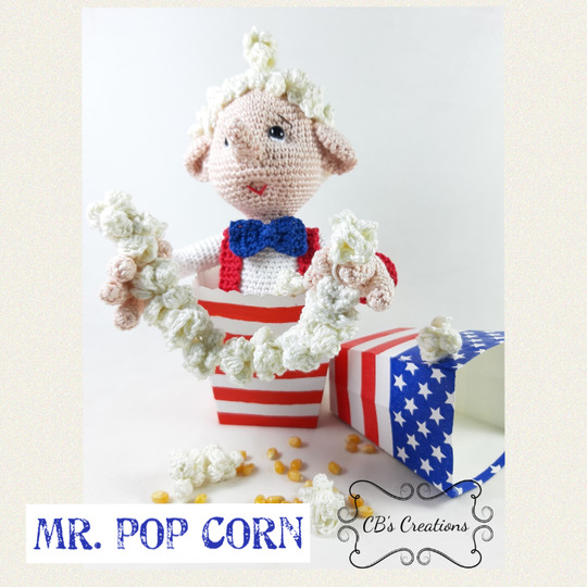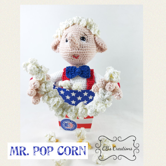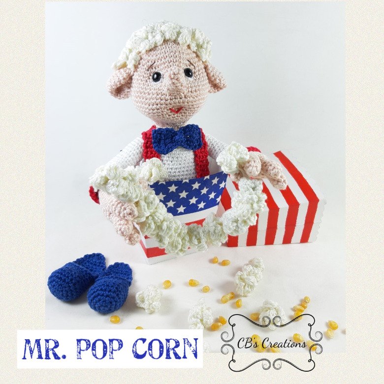 This PDF consists of 17 pages with instructions and pictures to show you how you can crochet Mr. Pop Corn yourself. The Crochet pattern uses US stitches and abbreviations.