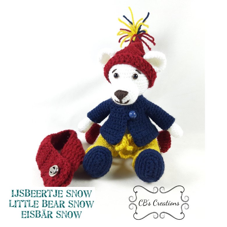 After making IJsbrand and Nordine Polar Bear I had to make a little Polar Bear. Snow has nice warm clothes just as IJsbrand and Nordine. He is sitting very comfortably in his sledge. Snow is designed as a sitting bear. His trousers are specially designed for a sitting bear.