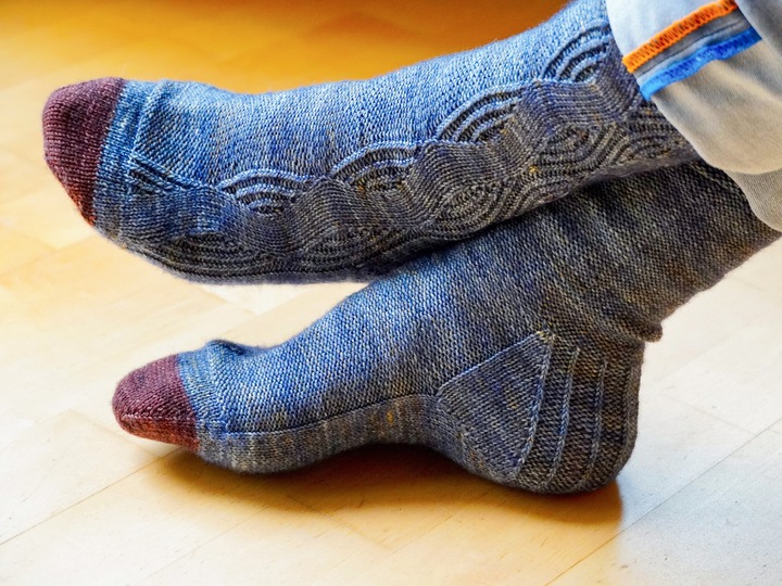 The socks are worked top-down on a circular knitting needle (= magic loop method) in rounds - i.e. from top to bottom or from the cuff towards the tip of the foot. Alternatively, it is also possible to work with DPNs or with trio-needles.