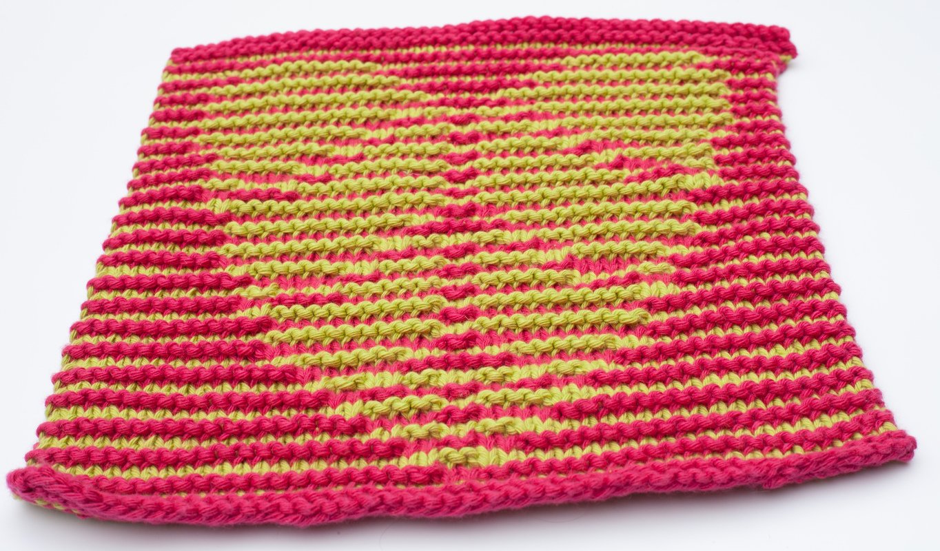 Shadow knitting is colourful and fun. From above you see stripes but viewed from an angle a leaf appears. I have made a dischcloth, but why not use this square as part of a blanket project? Make lots of them and sew them together to make a throw perhaps?