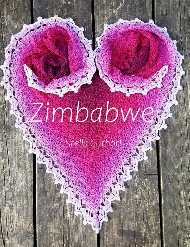 Das Tuch Zimbabwe hat die Form eines spitzen Dreiecks und schmiegt sich perfekt um die Schultern. Das Hauptmuster besteht nur aus zwei verschiedenen Reihen. Daher ist es sehr eingängig und kann nach wenigen Reihen auswendig gearbeitet werden.