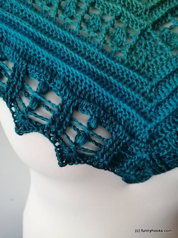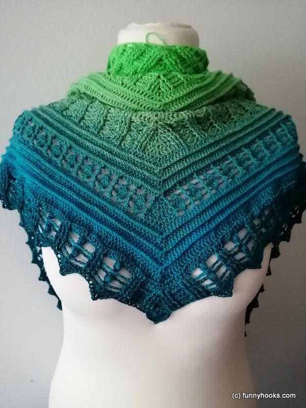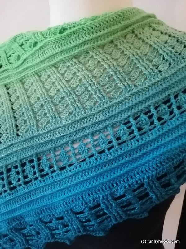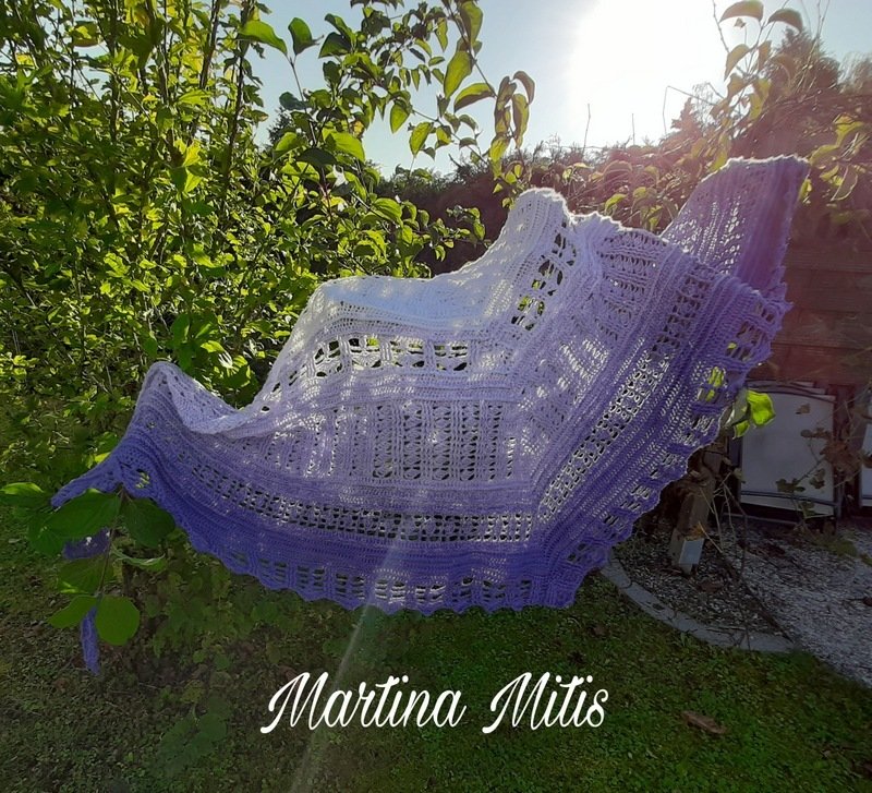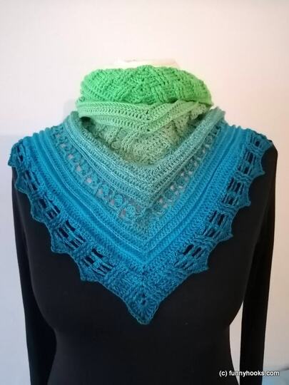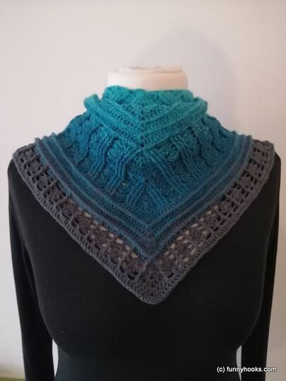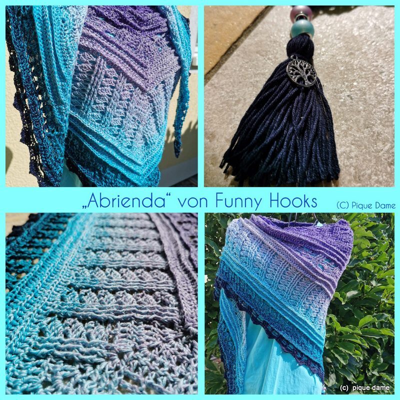 Abrienda is the shawl from the Funny Hooks CAL of the same name. It is a flat, not so deep triangular shawl,consists of many relief stitches and simply fits everywhere.