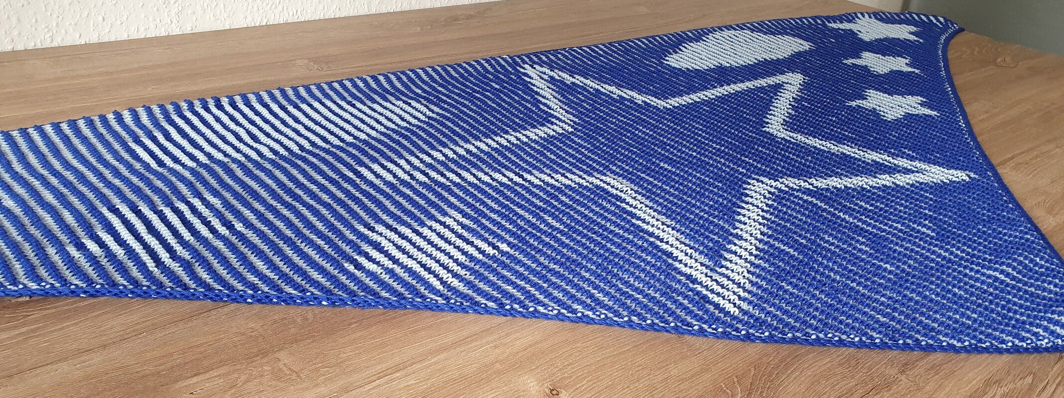 The finished shawl measures approximately 175 cm (width) x 78 cm (depth) in my version.