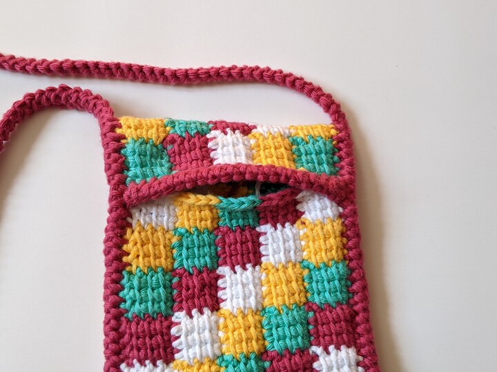 Kleine Quadrate werden tunesisch gehäkelt mit der corner to corner Technik verbunden, d. h. das Häkelstück wird diagonal von Ecke zu Ecke gearbeitet.