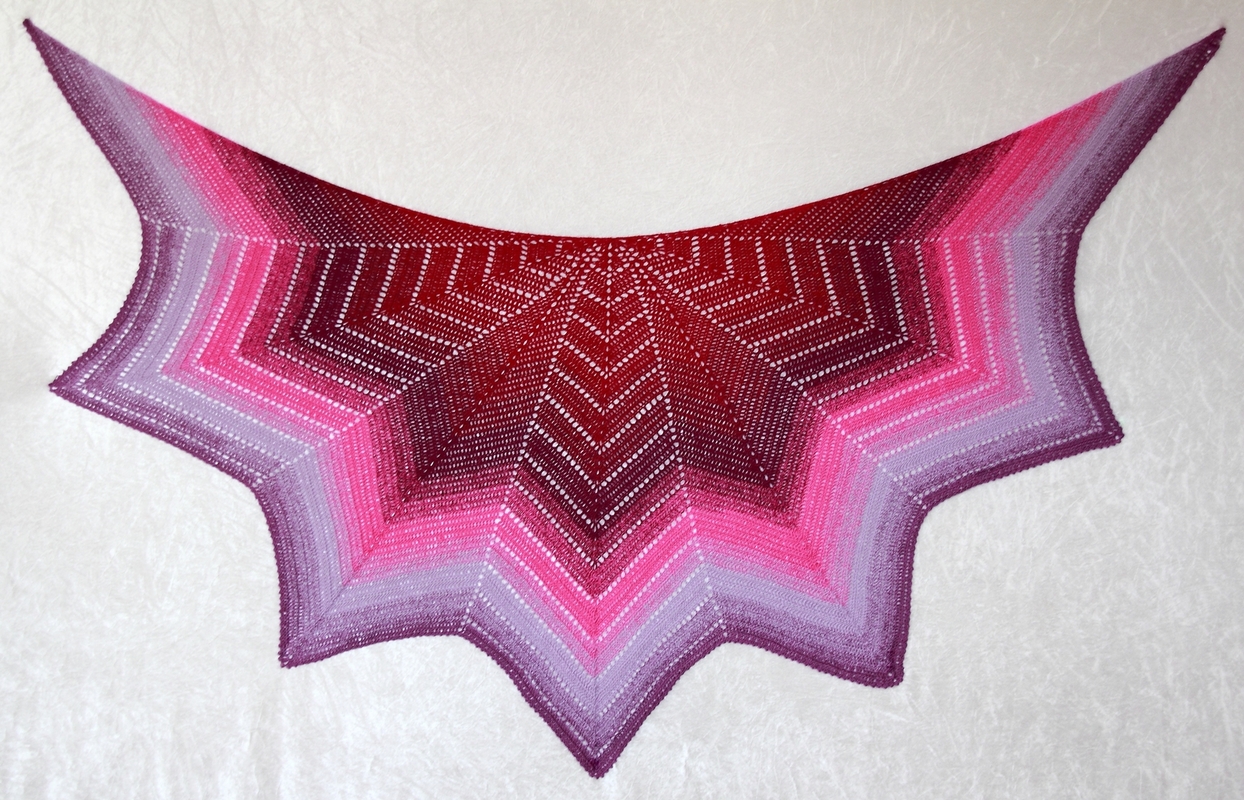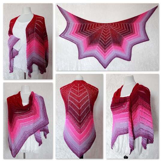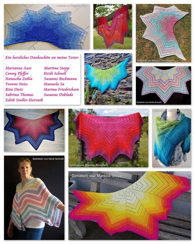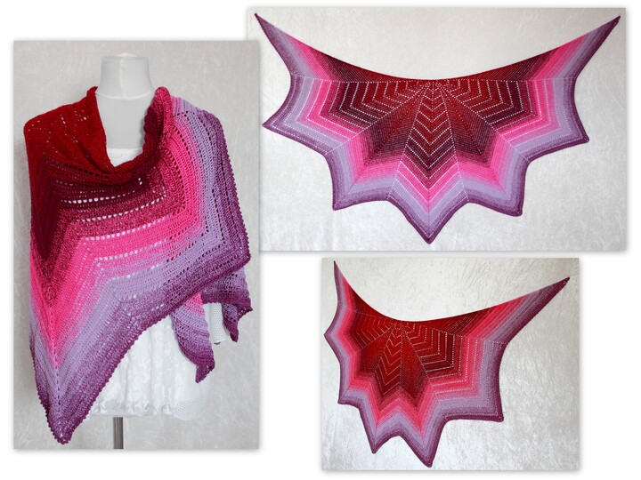 The crochet pattern for this star shaped shawl runs over 11 pages. It contains an detailed written pattern, professionally produced charts and many photos.