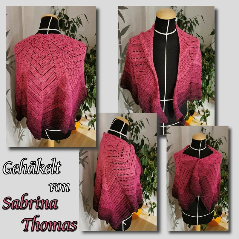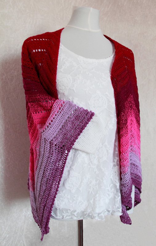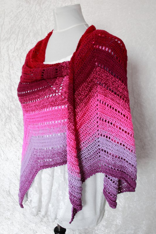 The measurements can vary depending on your own crochet method, the chosen yarn and the used needle size. My shawl measures about 180 x 76 cm.