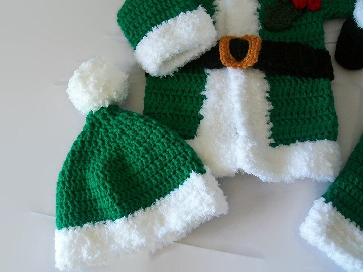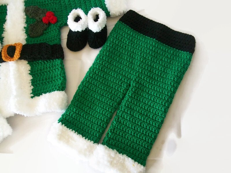 Who says Santa only wears red. This cute little santa suit written in a 12 month size is a perfect little outfit for holiday pictures. Although I did to it in green for something different it can definitely be done in red. Pattern is written for all that is seen in the pictures. All in US terminology.