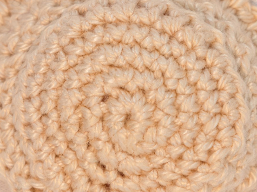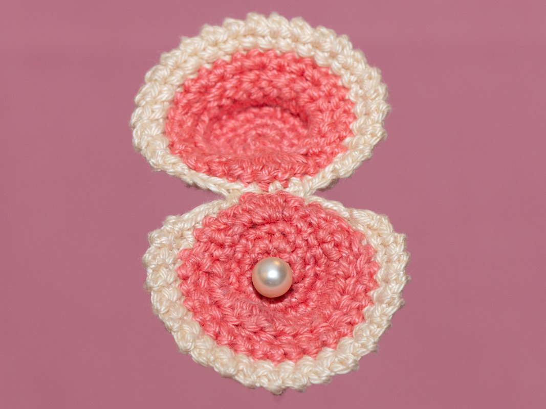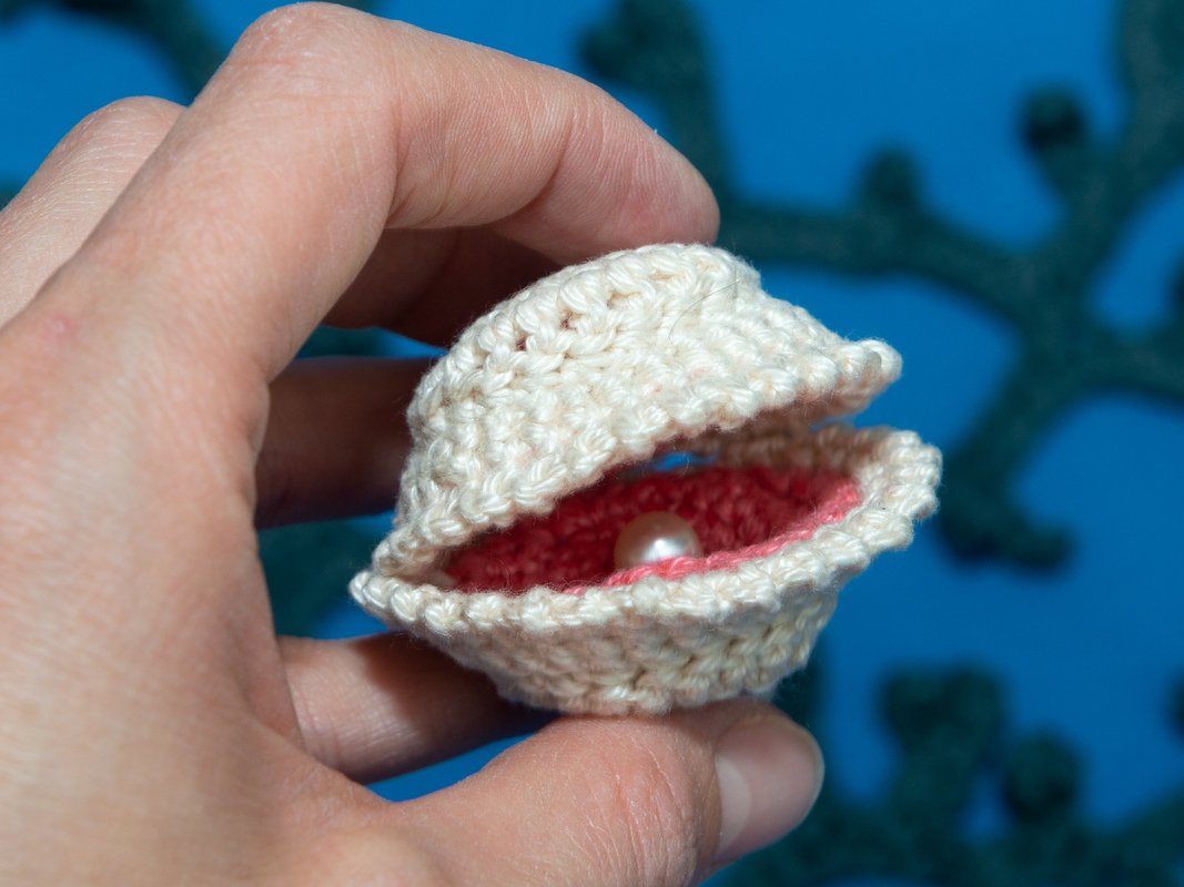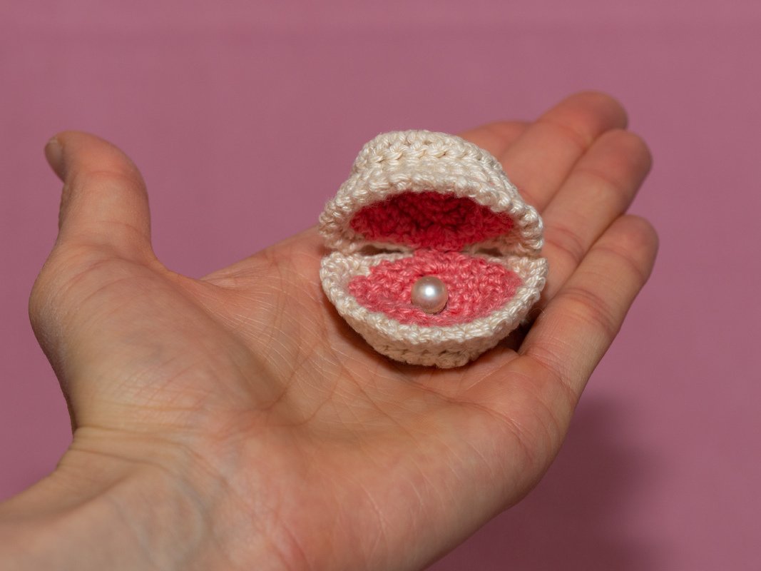 Muna the mussel consists of an upper and a lower shell. The two shells each have an outside (beige) and an inside (pink), which are crocheted together. The pearl is attached to the inside of the lower shell. Finally the upper and the lower shell are sewn together.