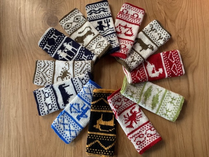 Diese Armstulpen sind in einer Technik namens double face gestrickt. Dies bedeutet, man hat innen keine Fäden gespannt, an denen man beim Anziehen auch noch hängenbleibt (und zu allem Übel vielleicht auch noch Fäden zieht!). Vielmehr kann man sie einfach wenden und hat dann zum Beispiel kein dunkelblaunes Zwillingspaar mehr auf weißem Grund, sondern ein weißes Zwillingspaar auf dunkelblauem Grund. Oder eine rote Waage auf weißem Grund anstelle einer weißen Waage auf rotem Grund...