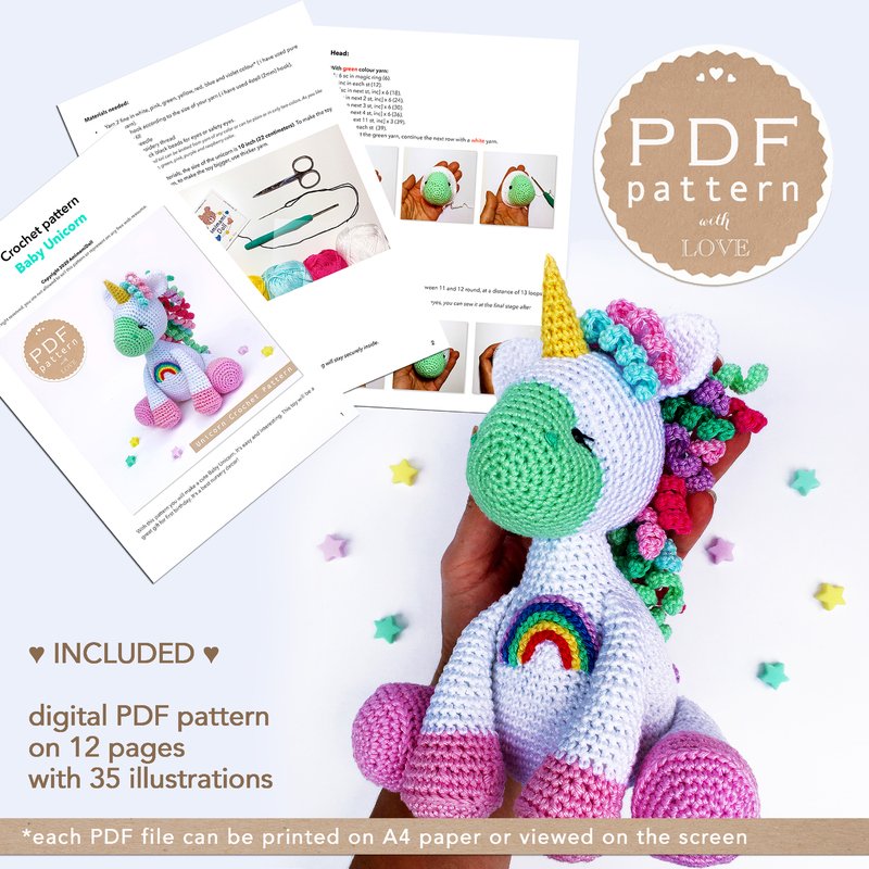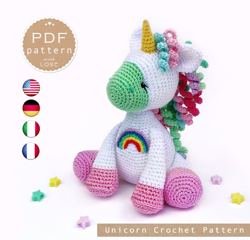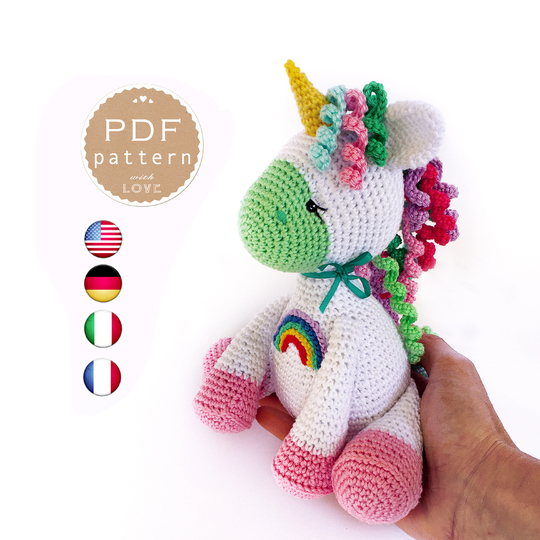 Crochet pattern Amigurumi Cute Unicorn with Rainbow. Amigurumi animals for Nursery room decor.