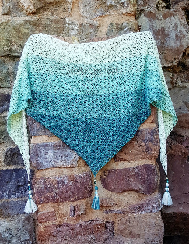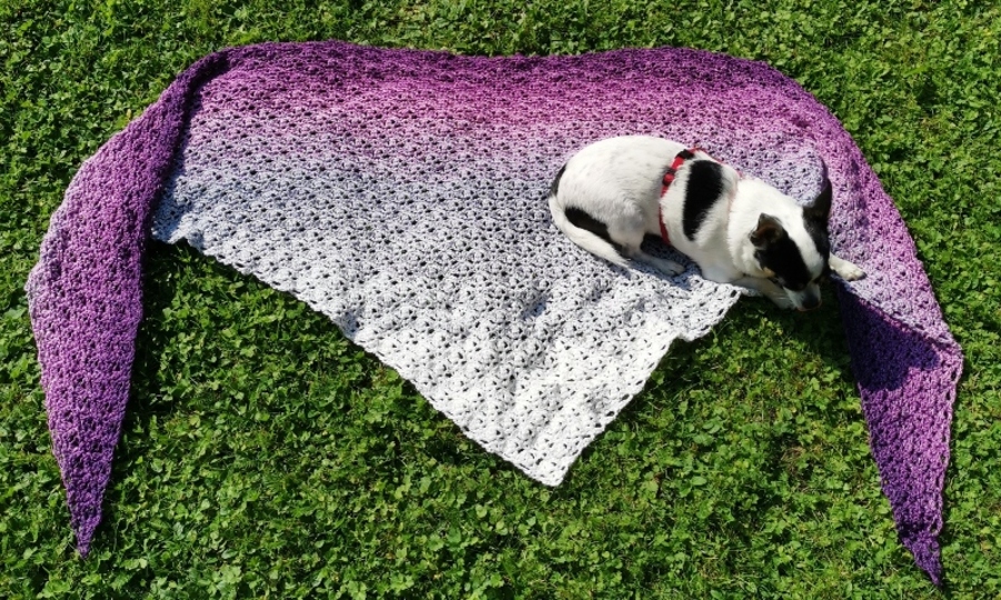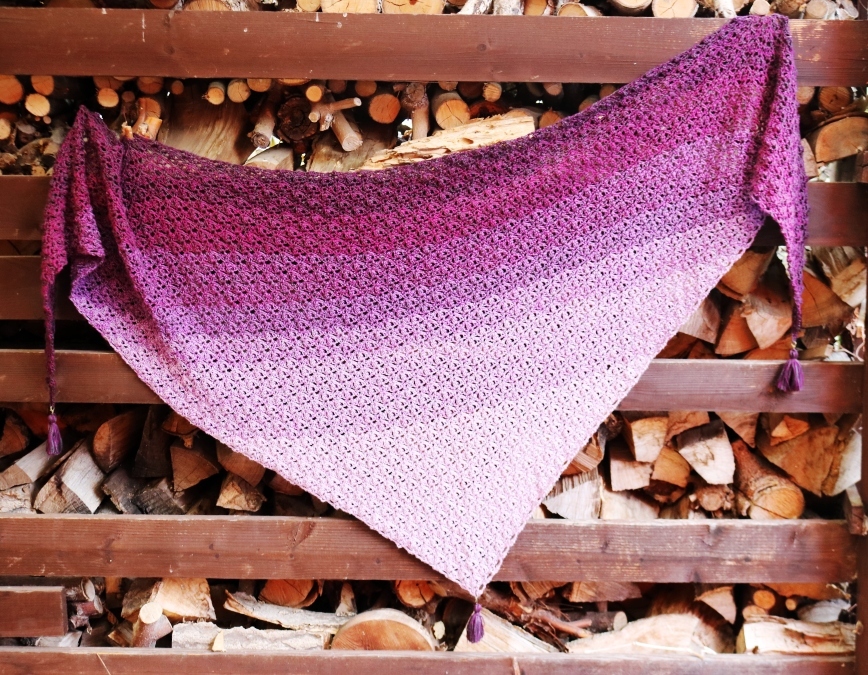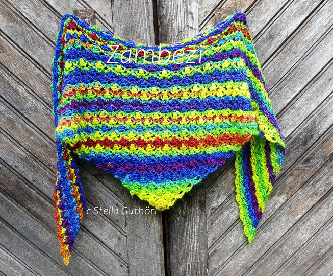 The Zambezi scarf is shaped like a flat triangle and hugs the shoulders perfectly. The main pattern consists of just two different rows. Therefore it is very catchy and can be worked by heart after a few rows.