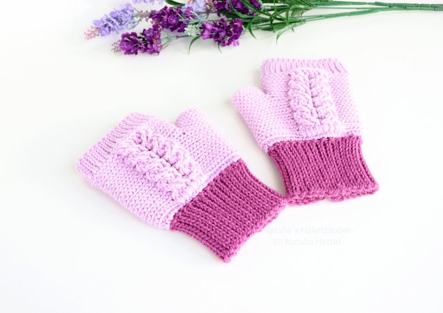 Gloves: Katia Basic Merino, 52% Merino, 48% Acrylic, 50 g/120 m, Alternative: Merino Extrafine from Drops, Composition: 100% Virgin wool, Running length approx. 105 m / 50 g, For adults: 50 g of the colour Purple and 100 g of the colour Pink. For children: 50 g of the colour purple and 50 g of the colour pink. Crochet hook no. 4 and 4.5 (EU-size)