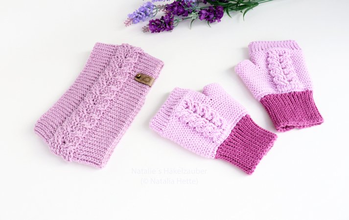 It is explained Headband: material, explanation for all sizes, cuffs and cable pattern, 10 pages, over 20 photos, description, video for cable pattern (row with the crossings).