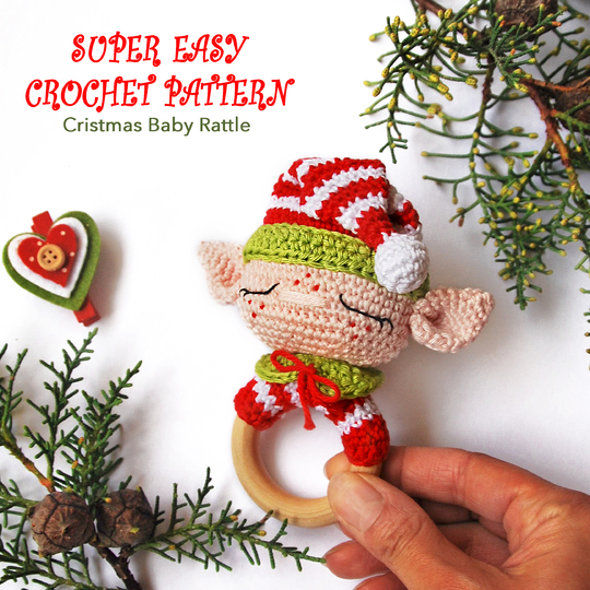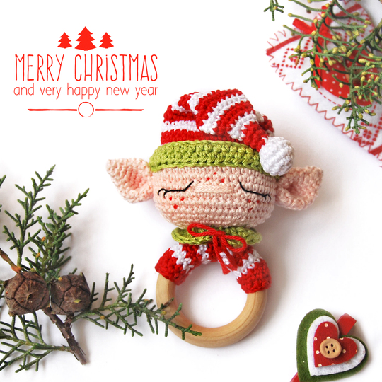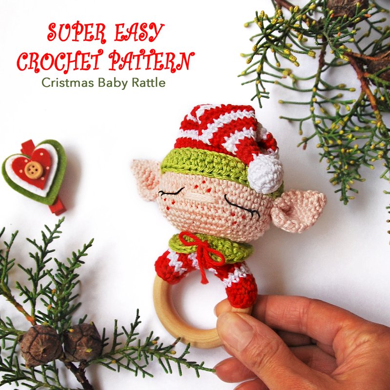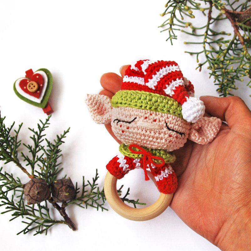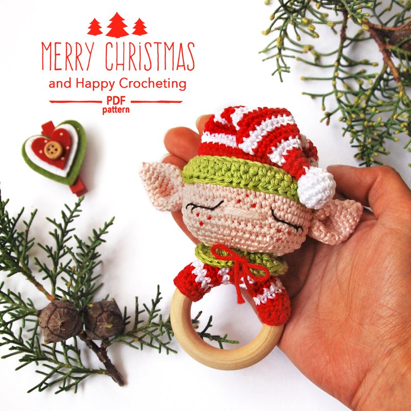 Crochet pattern baby rattle Christmas Elf. Amigurumi pattern - Christmas holiday DIY gift for new baby and toddler. Xmas ornament.