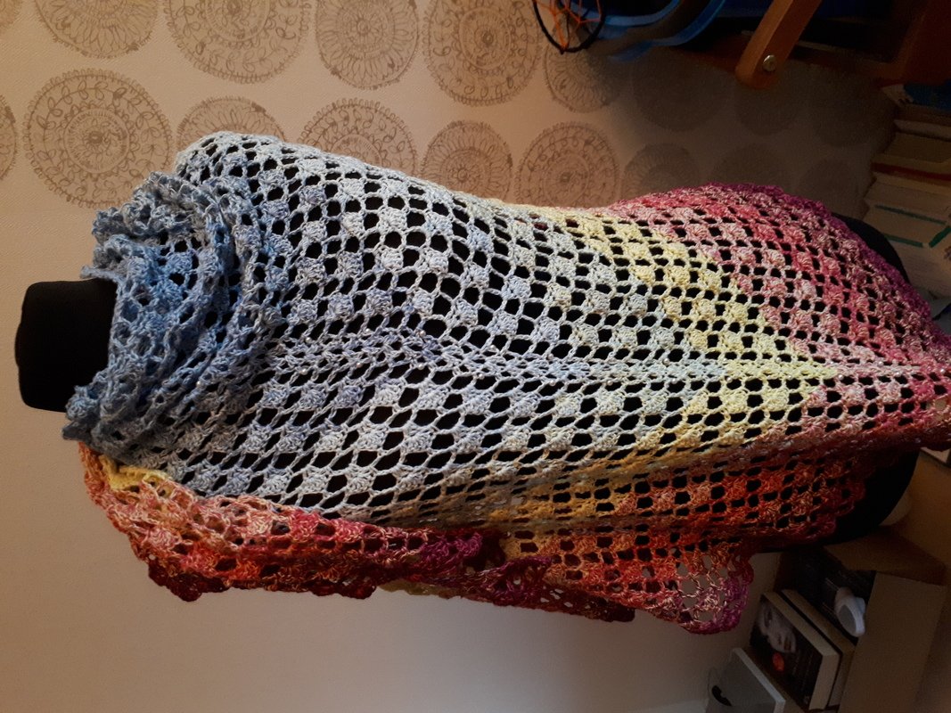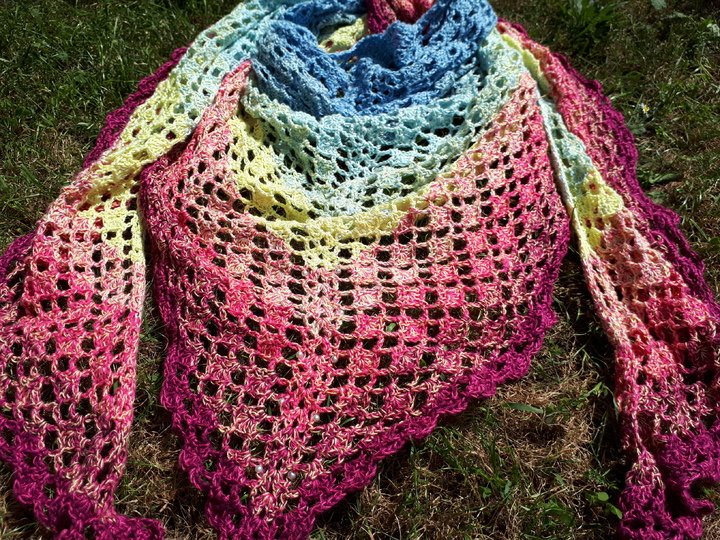 Anleitung für das fast gleichschenklige Dreiecktuch Sömmerdagen, mit dem luftigen Maschenmuster des Sömmertied.