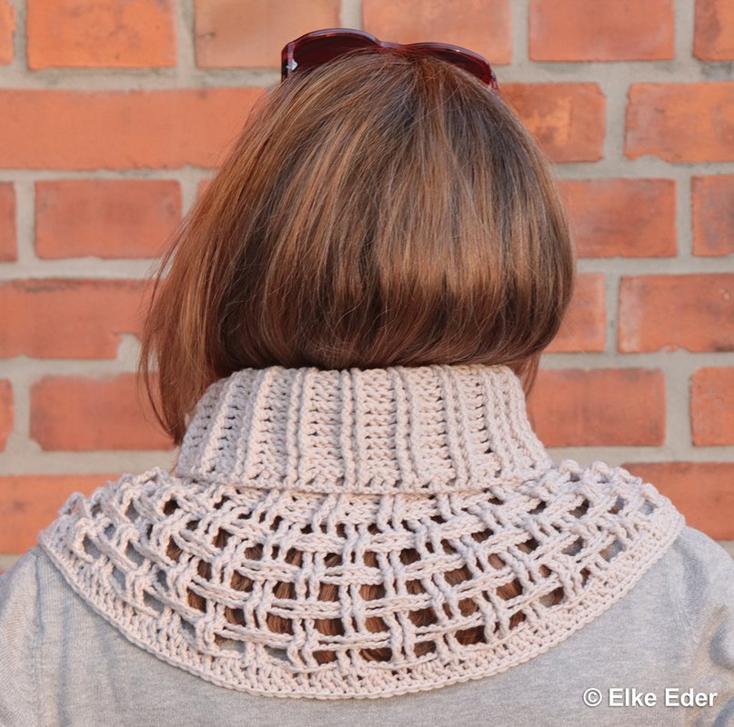 The shawl collar is crocheted tightly at the top of the neck to keep the neck nice and warm. The lower part is crocheted more airily with a beautiful relief pattern, so that not too much warmth develops under the jacket.