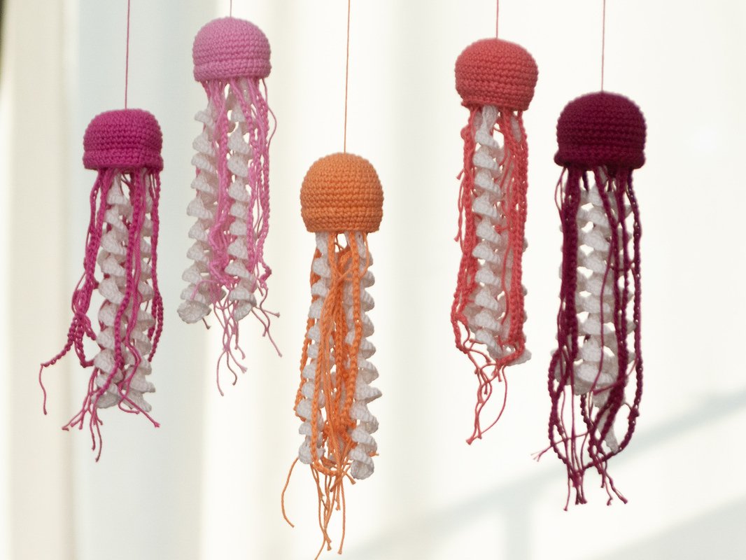 The fire jellyfish looks quite sweet and harmless, but it is not so. On its jellyfish body hang the dangerous oral arms and tentacles, which discharge their nettle capsules when touched. This causes terrible burn pain on the skin. Hence the name fire jellyfish. The fire jellyfish use this characteristic to protect themselves from predators. Thanks to cotton yarn, this is not the case with Fiffi the fire jellyfish. On the opposite, their pretty tentacles are easy to touch and are even a very special sensory experience, for early babies because they remind us of the umbilical cord, for babies to feel their sense of touch and also for us adults because it just feels good.