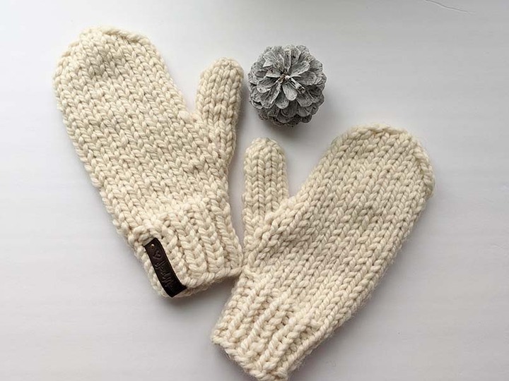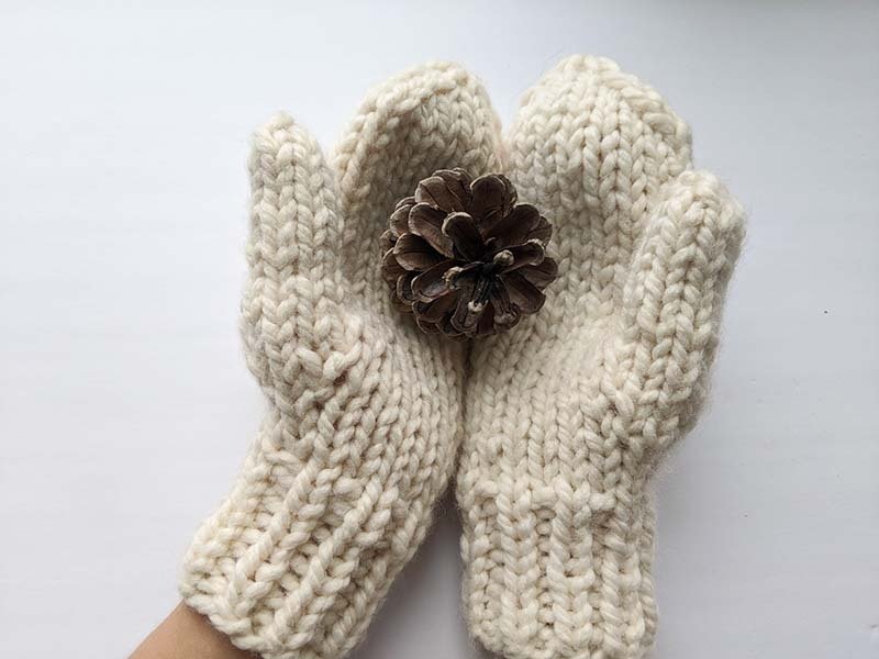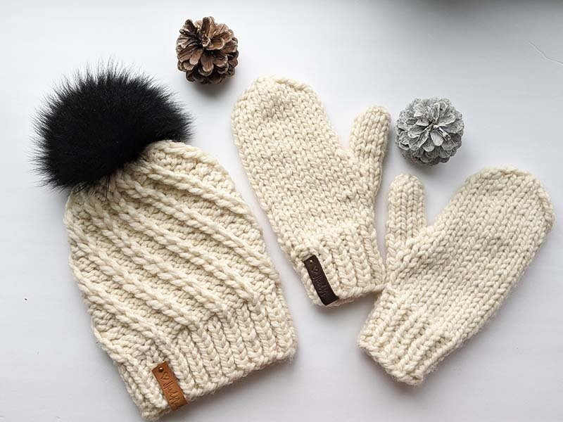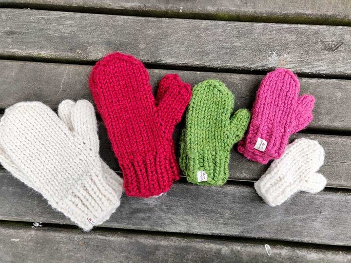 This is a classic-looking family set of knit mittens designed for all sizes - toddler, child, teen, women’s small, women’s medium, men’s medium.