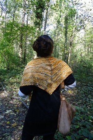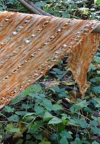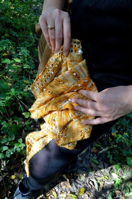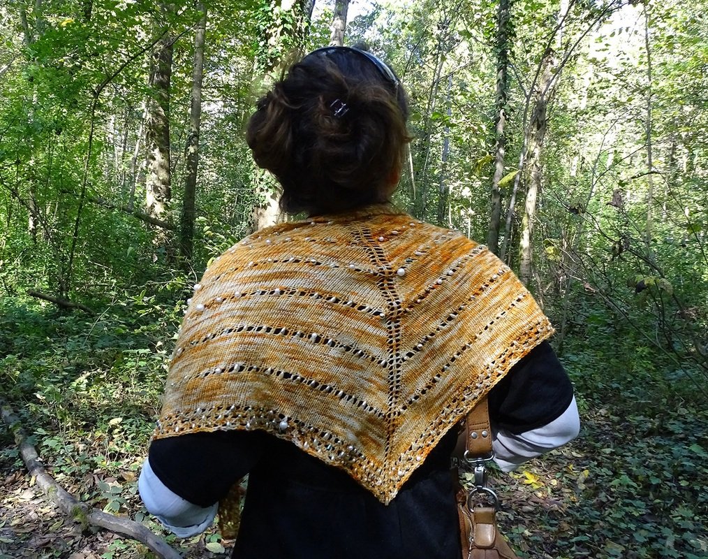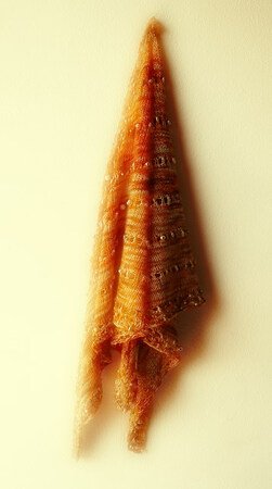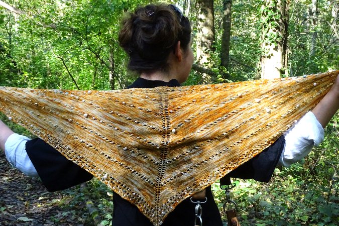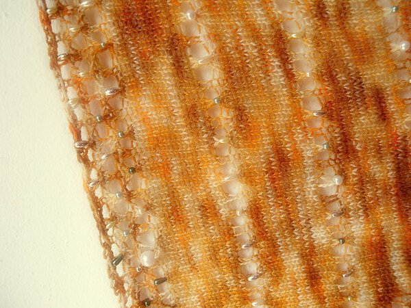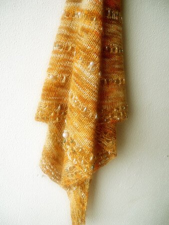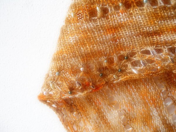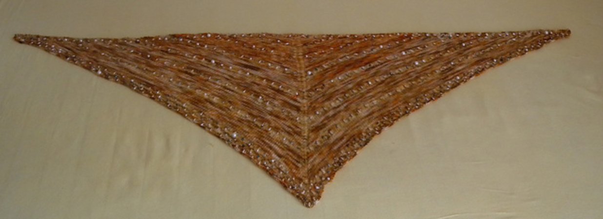 Difficulty level: easy (basic shawl construction, easy lace stitches, beading)