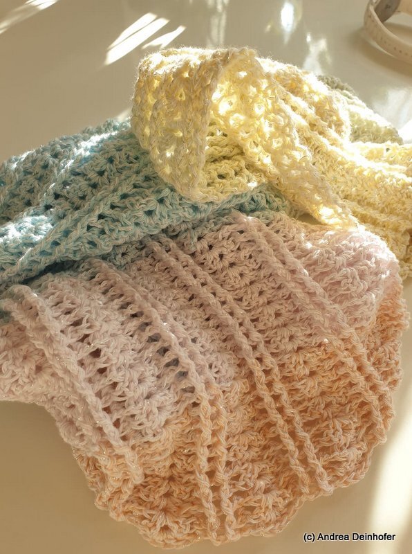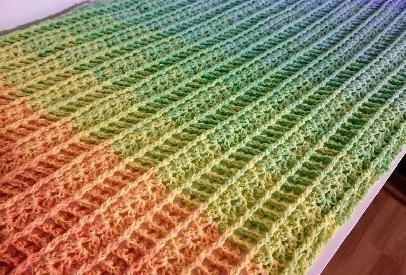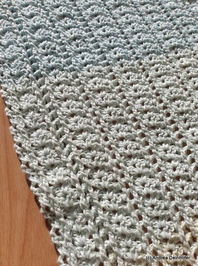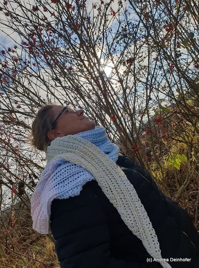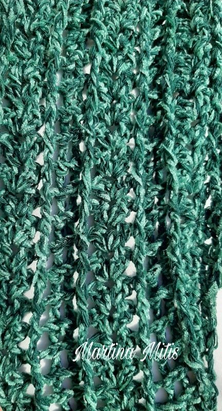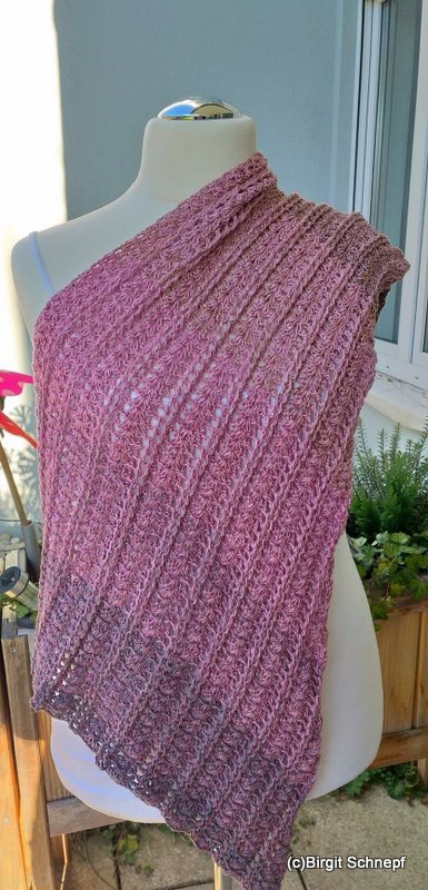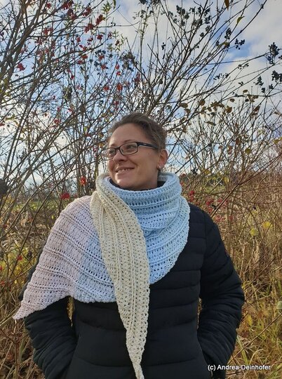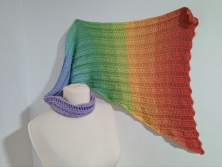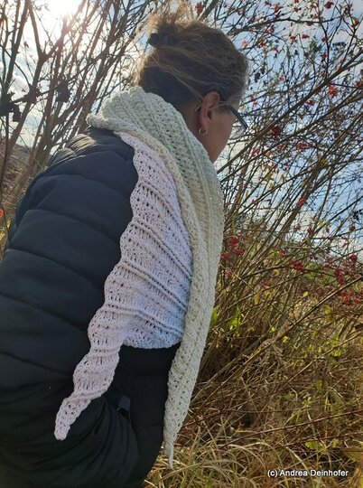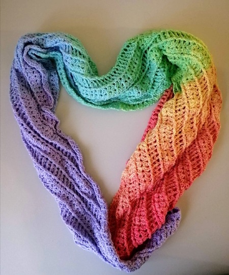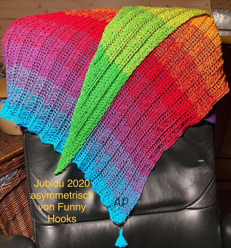 The Jubidu 2020 is an asymmetrical scarf that can be worn on both sides. The pattern is quite simple and chilled to crochet.