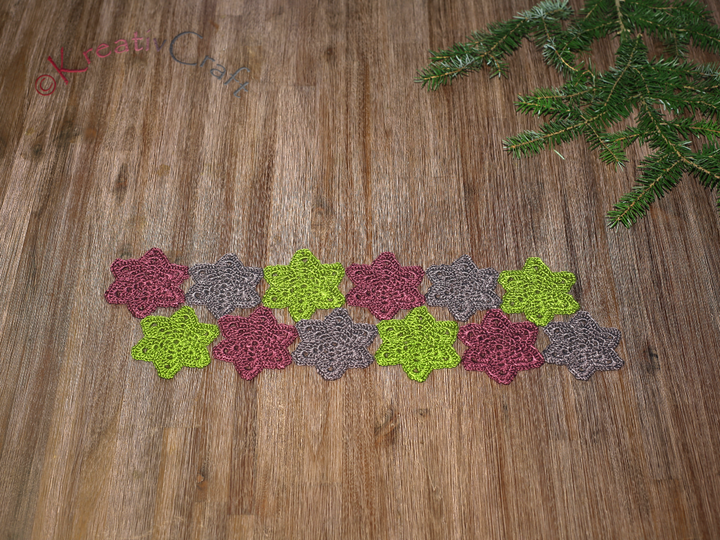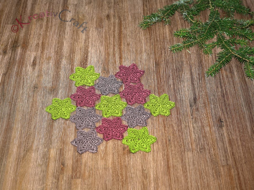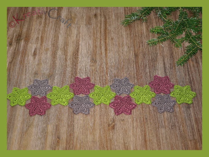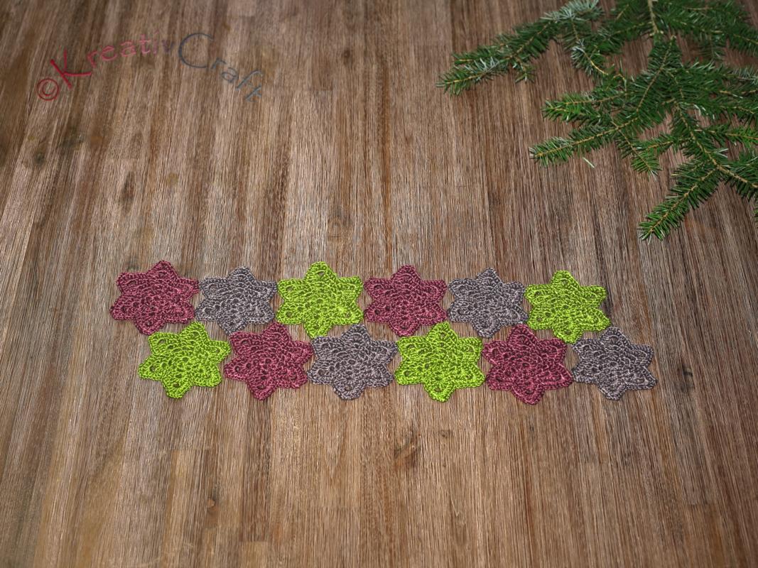 In my crochet pattern I explain every single step to you using a detailed description including illustrative pictures with hints so that you can crochet the table runner with star motif with ease.