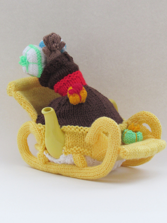 The main part of the tea cosy is knitted up to be the bottom part of the sleigh and Santa's sack. The back and front of the sleigh are knitted separately and attached. The front and back sleigh parts are stiffened with Funky Foam, if you Google 'Funky Foam sheets' you will find it.
