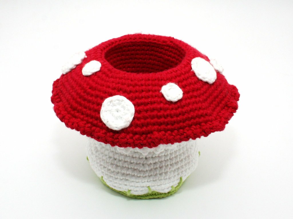 With 3.0 mm hook and DK yarn or 2 strands of sport weight yarn the mushroom gets to be 11 cm tall & 14 cm wide.
