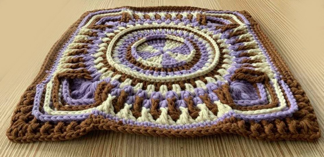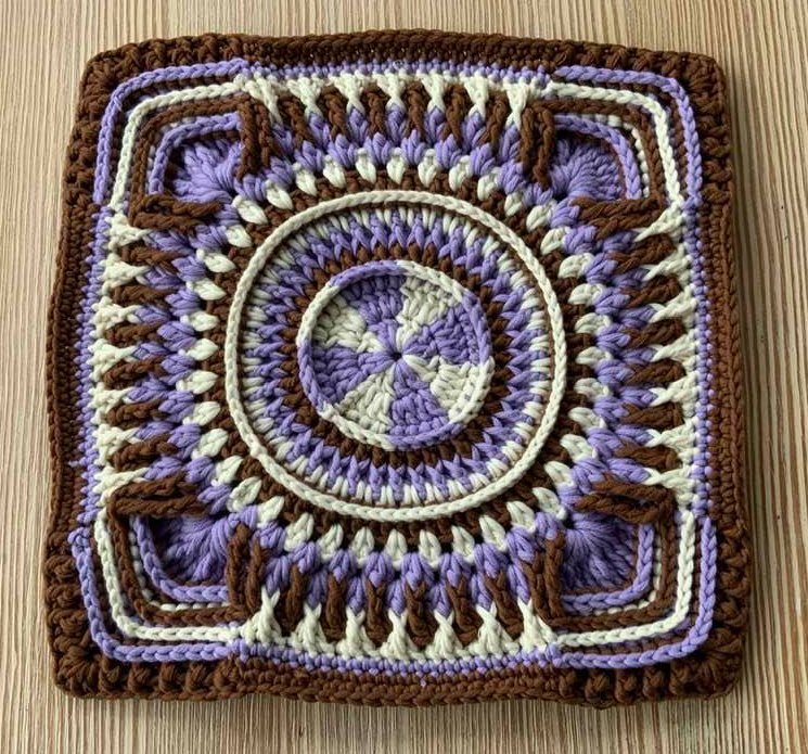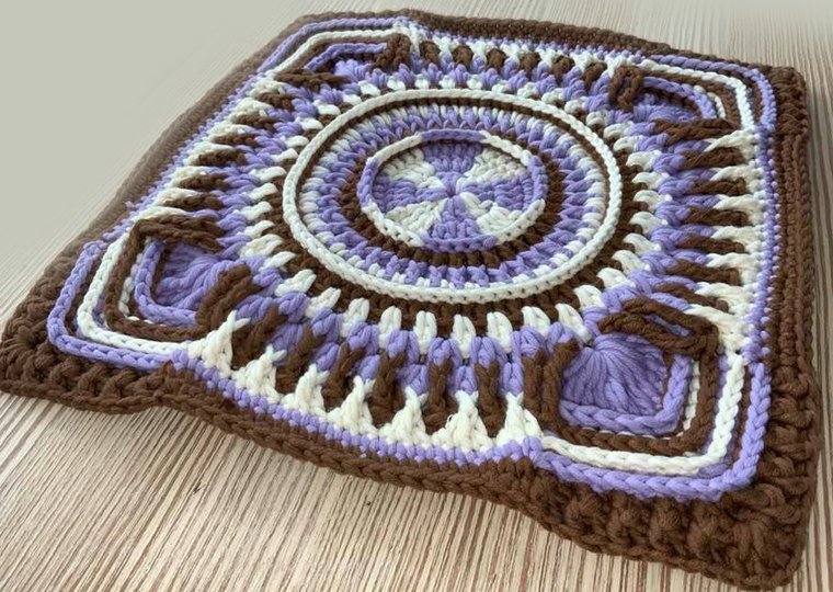 Mit dieser dicken Wolle und der Häkelnadel 4,5 hat das fertige Grannymuster "Großer Kreisel" bei 15 RUNDEN eine Seitenlänge von 36 cm + wiegt 214 gr