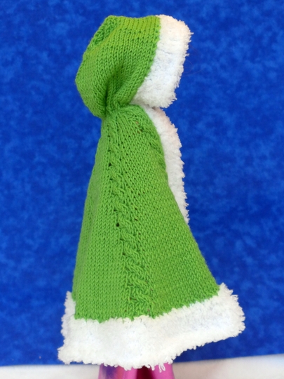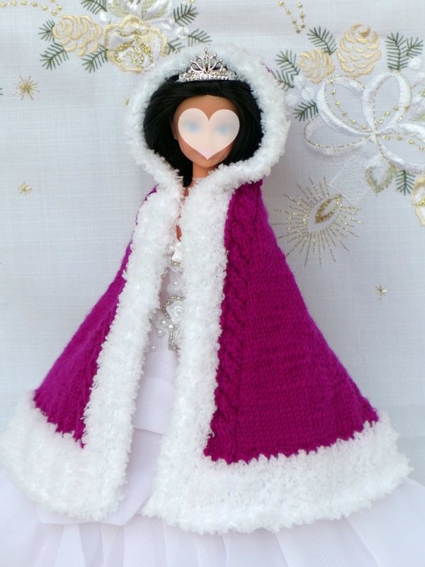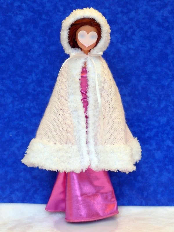 This one is knitted and has a nice big hood and a wide white hem all around. It is variable in length and fastens at the neck with a decorative clasp. It falls open at the bottom so that you can still see the beautiful dress underneath. In this outfit, the doll is sure to be the most beautiful at the ball and will enchant the prince :-)