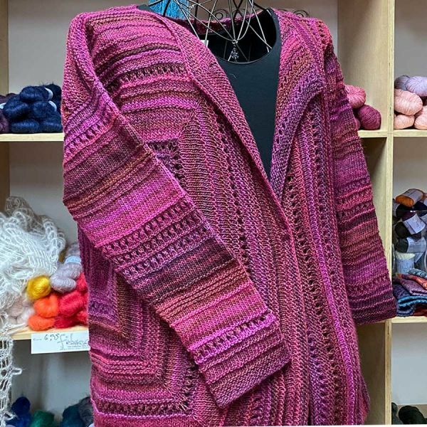 This pattern shows you how to knit a stunning square cardigan that can be worked in any individual size. It was originally designed for Filace Moira, the yarn with the wonderful colour changes. The original yarn can be substituted by any variegated yarn in a similar weight.