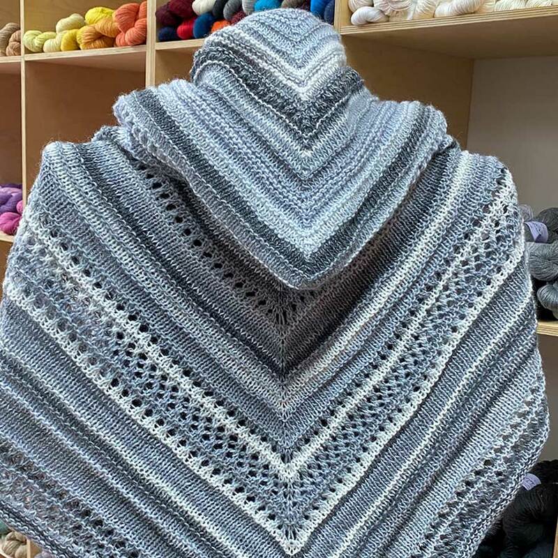 With this pattern, you can knit an impressive triangular shawl with integrated hood in a size of your choice. This pattern has been designed to showcase the beautiful yarn Filace Moira with the wonderful colour changes, but Moira can be easily substituted with a variegated yarn of similar weight.