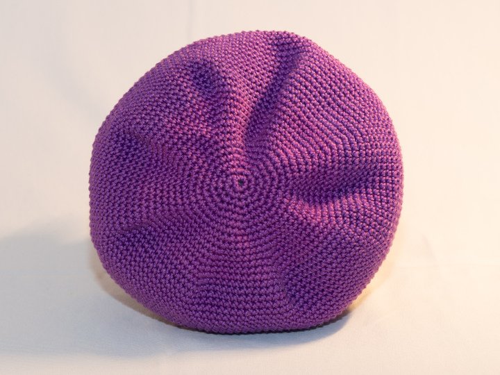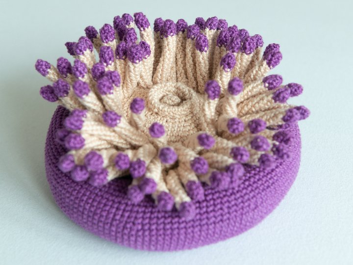 First crochet the mouth and cap of Anna the sea anemone. Then the many tentacles are crocheted. These are then sewn onto the cap. Then the body is crocheted. Now the body is stuffed with absorbent cotton. Then the cap is crocheted to the body including all the tentacles sewn to it.