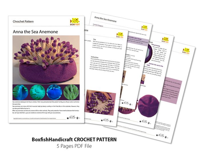 Anna the Sea Anemone is 17 cm wide and 12 cm high (including the tentacles). If you want to crochet a bigger or smaller version, you can use a thicker or thinner yarn and a thicker or thinner crochet hook.