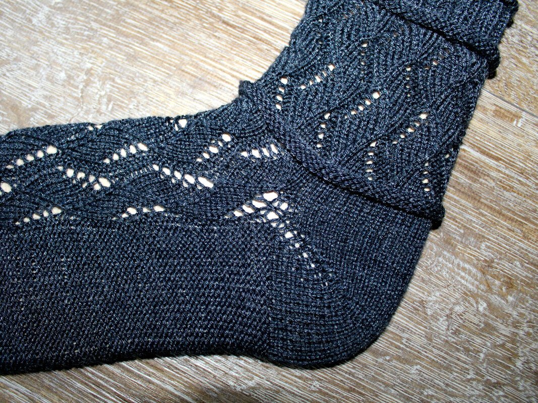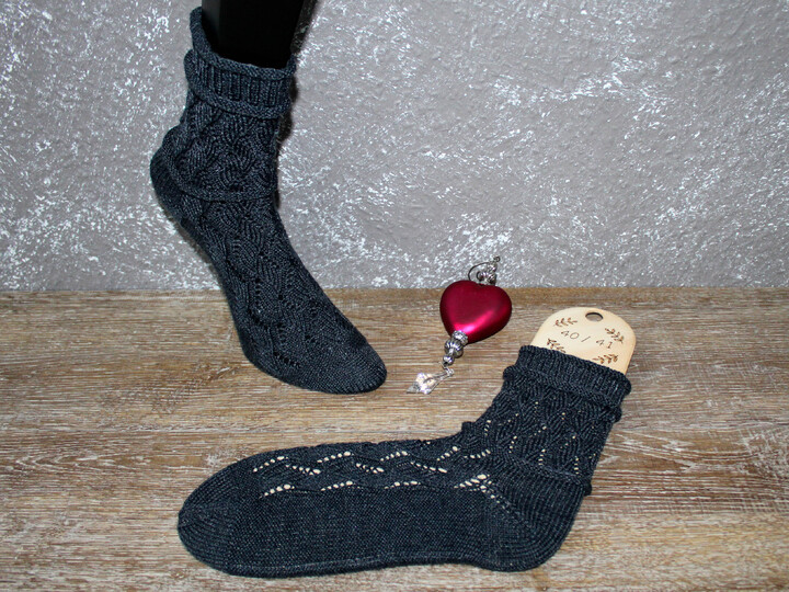 Anleitung für ein edles Sockenmuster in Größe 40/41 in Uni. Das Lochmuster ist einfach. Einen zusätzlichen Effekt bilden die beiden Rollränder und die glatt links gestrickte Fußsohle.