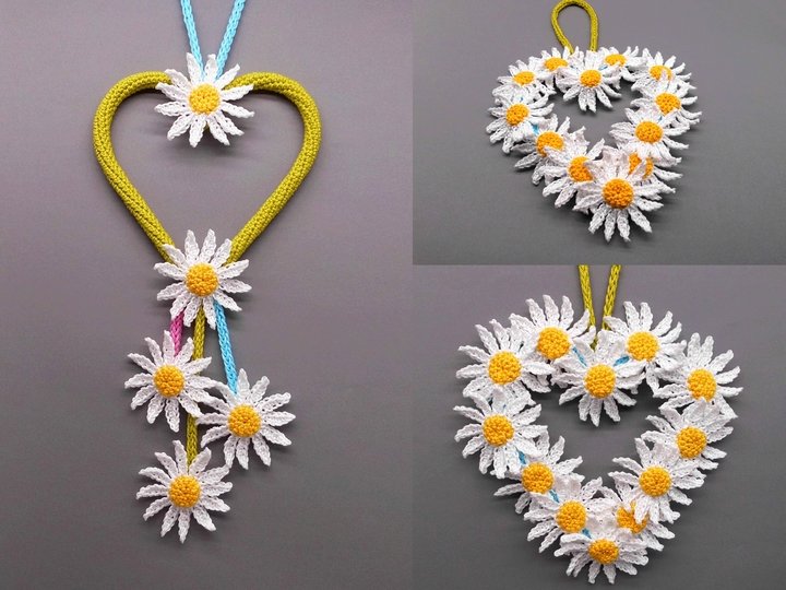 The daisy heart can be easily and quickly crocheted, even by beginners with a little practice, and customized with more or less flowers, colorful ribbons or beads as desired.
