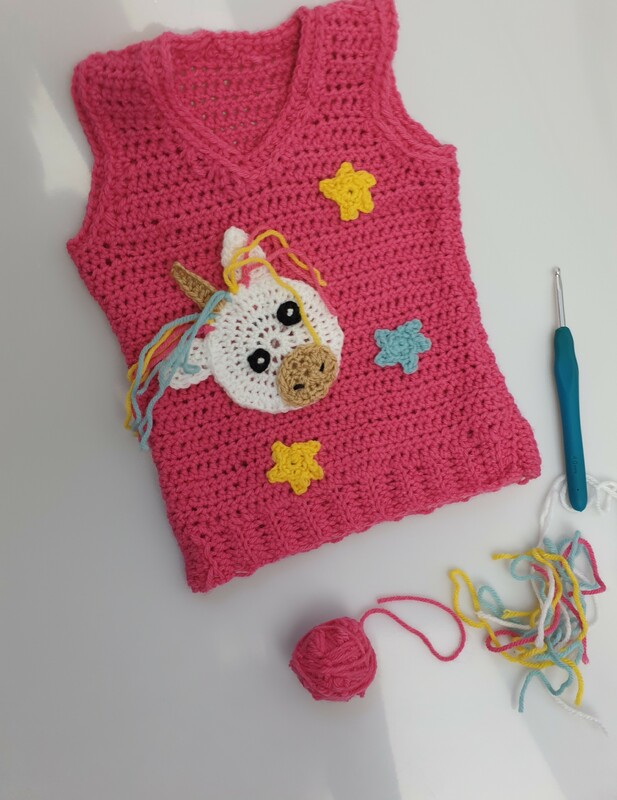 This is a Pattern for a Beautiful, cosy vest in 7 Sizes, with 2 applique patterns included to sew on to the vest. It is worked in 2 pieces and sewn together. The vest is worked with HDC and around the neckline and armholes in HDC in 3rd loop. It can fit either boys or girls and can be worked with any DK Yarn as long as the Gauge is right.