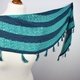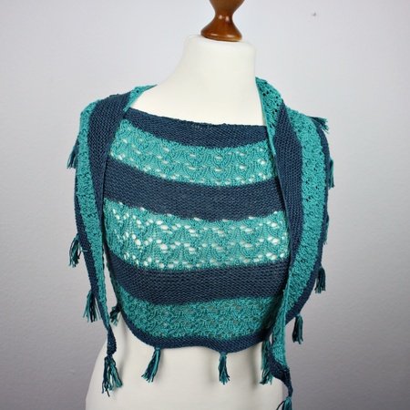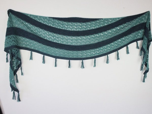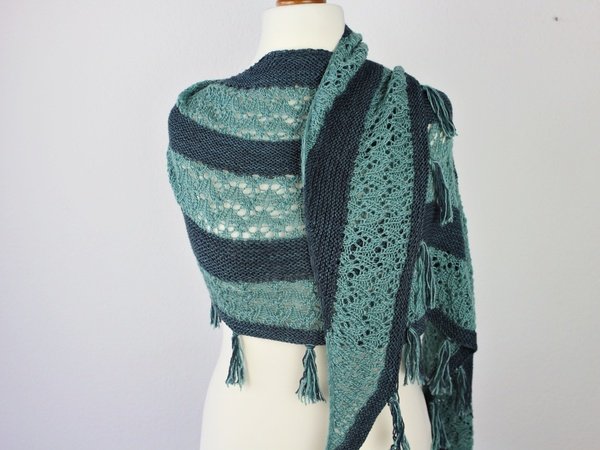A Crescent shaped shawl with some garter stitch, beautiful lace parts and some modern fringes.