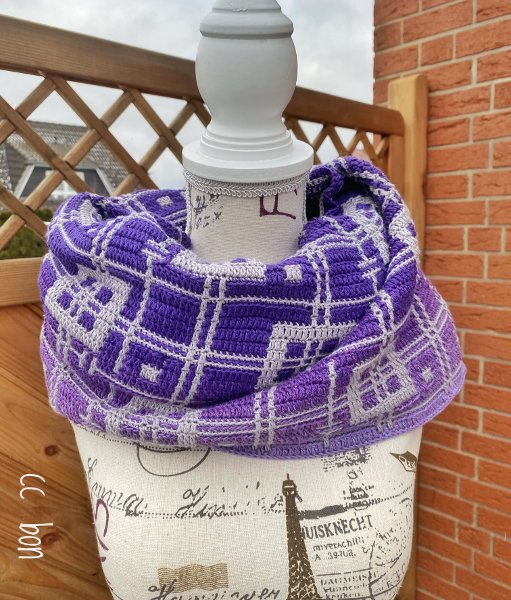 I have crocheted the scarf using different Scheepjes whirls (1000m/220g) and whirlettes (455m/100g) and hook size 3.5. For my size of scarf the amount of yarn is: color A (violet) 1000 m , color B (gray): 750 m