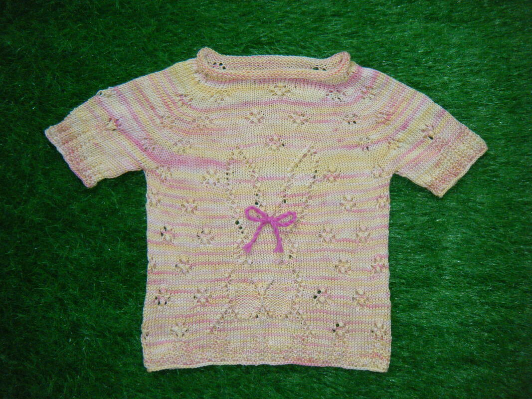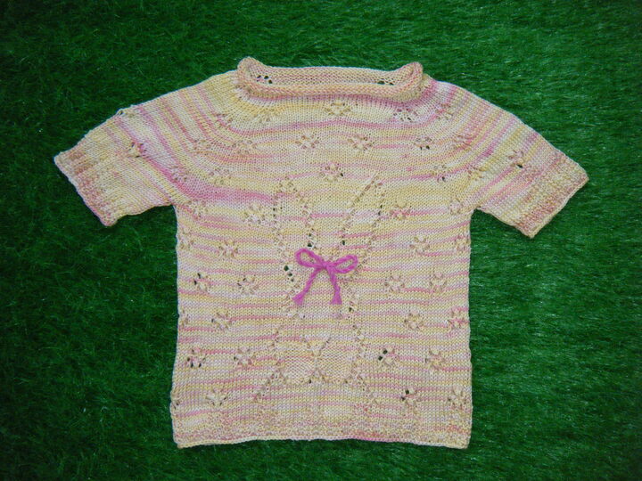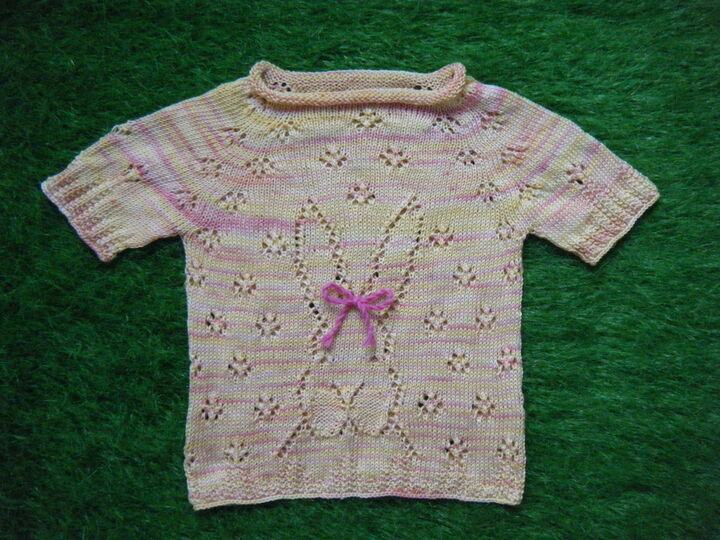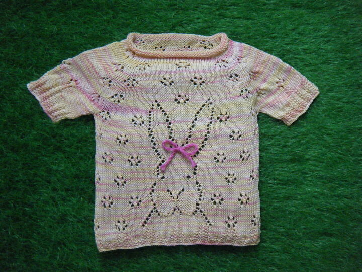 The raglan knitted from top down with colourful yarn cuts a good figure all year round. Worn over a thin dark green turtleneck in winter, the bunny even becomes a Christmas bunny....
