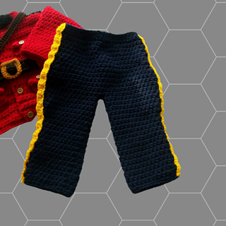 The jacket, pants, boots, and hat. And of course I tried to add as many embellishments like the big girls and boys that I could. The pattern is done all with worsted weight yarn and does not take much at all. It is written in US terminology and actually quite a basic pattern. A beautiful keepsake for any policing family. Photo prop pictures would be adorable in this as well.
