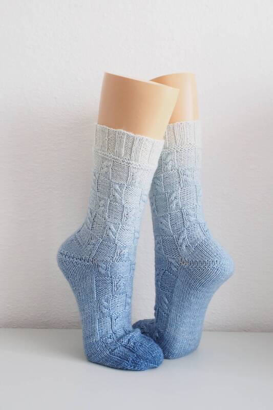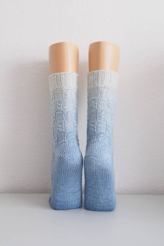 These socks have a simple pattern which is great for beginners. Like on a checkerboard the blocks with the cables alternate with blocks of purl stitches.