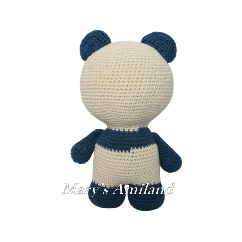 The body and head are crocheted in one piece starting from the feet up to the head. Only arms, ears and muzzle are sewed on.