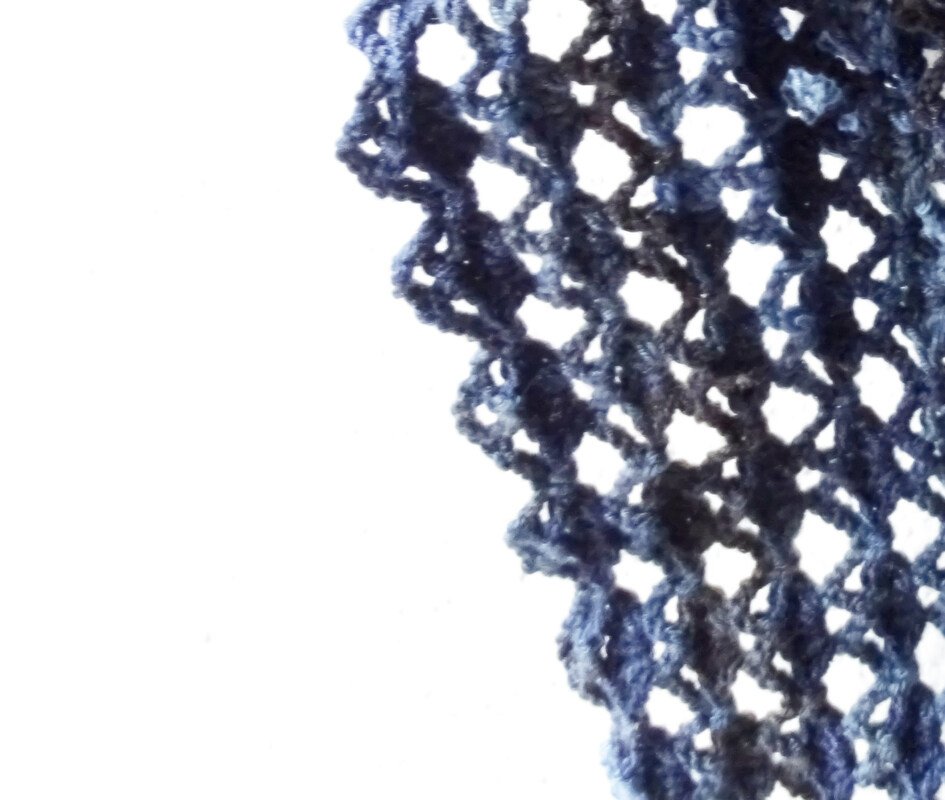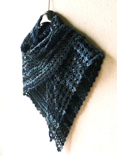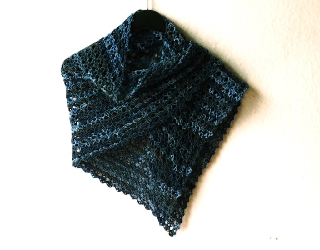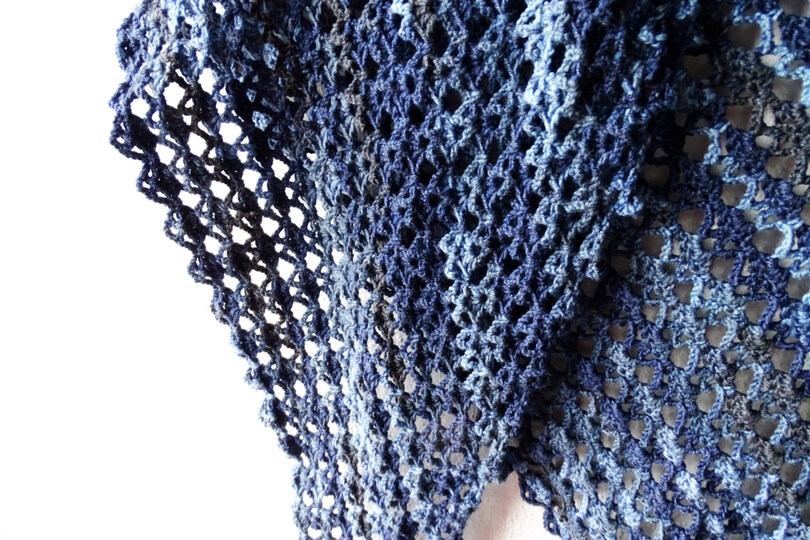 The shawl is worked diagonally from side to side in an easy lace pattern. Although the pattern is written for fingering weight yarn, it will work in any other yarn and matching hook as well.