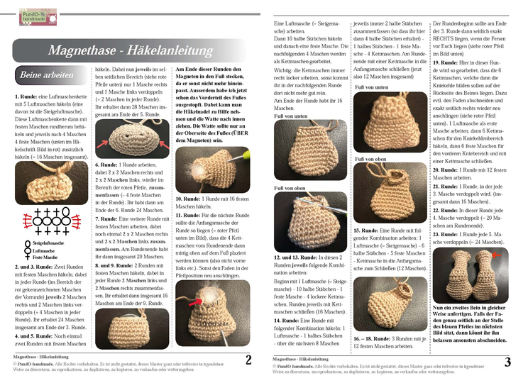 Der Hase wird nur mit festen Maschen gearbeitet. Ihr braucht dazu den magischen Ring, solltet Maschen verdoppeln und zusammenfassen können. Für die Hose braucht Ihr halbe Stäbchen und außerdem noch Luftmaschen und Kettmaschen.
